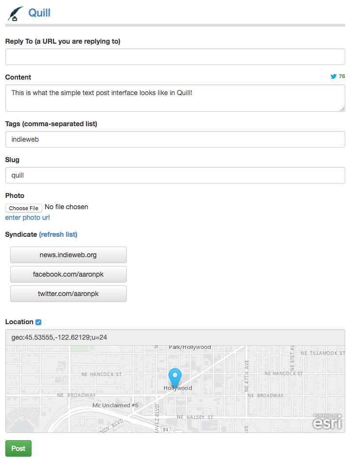 The following properties will be sent in the Micropub request. This request will be sent as either a form-encoded or a multipart-encoded request, depending on whether there are photos and whether you have a Media Endpoint.